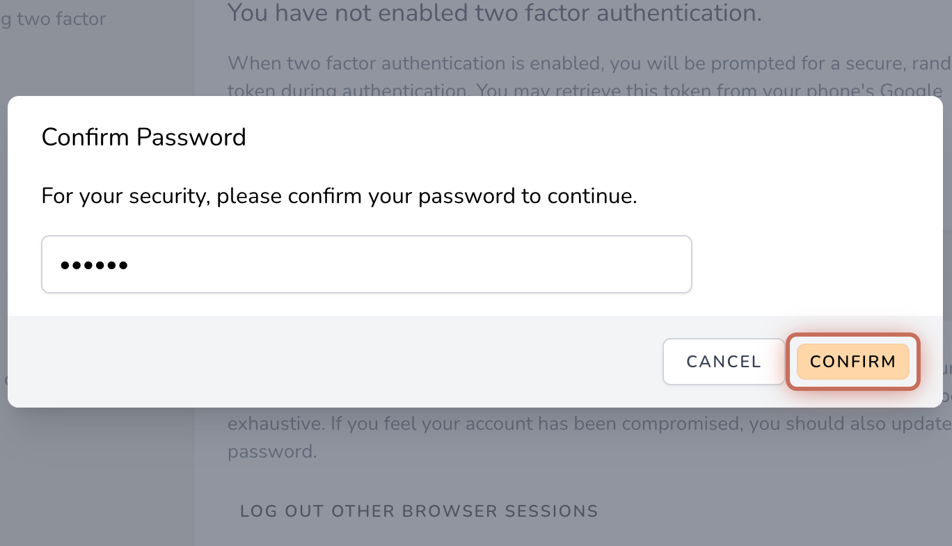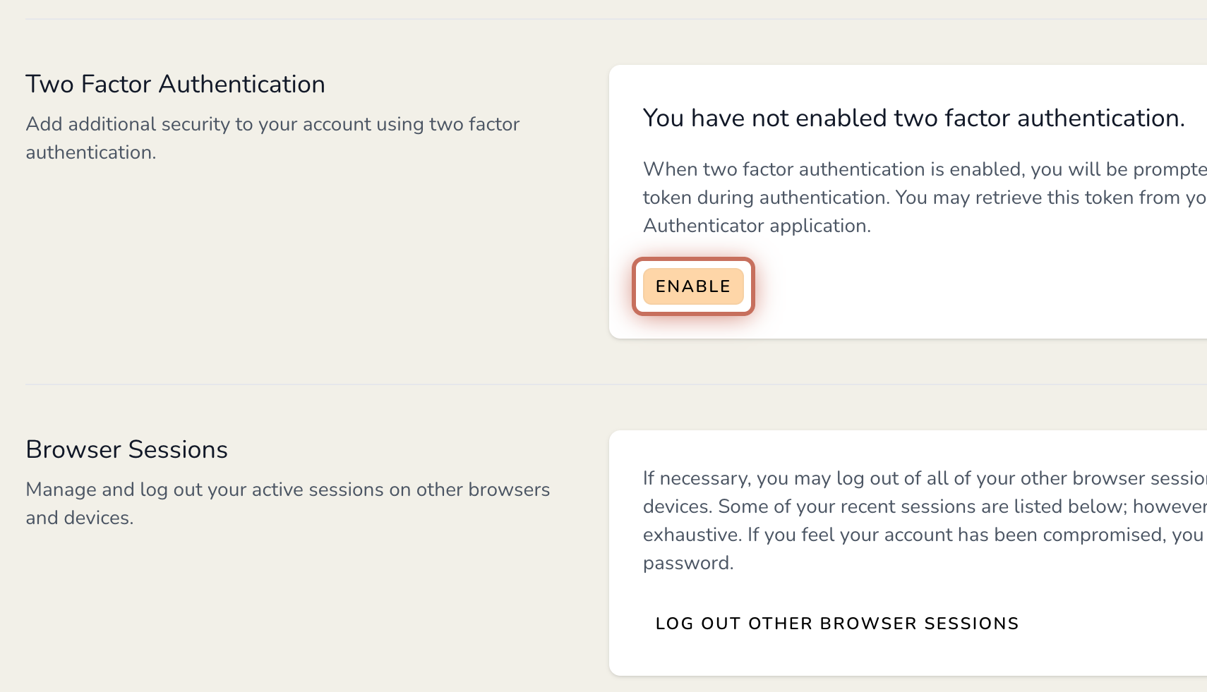 3. Scroll down to the Two Factor Authentication section and click ENABLE.