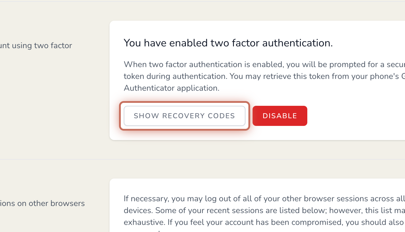 3. Scroll down to the Two Factor Authentication section and click SHOW RECOVERY CODES.