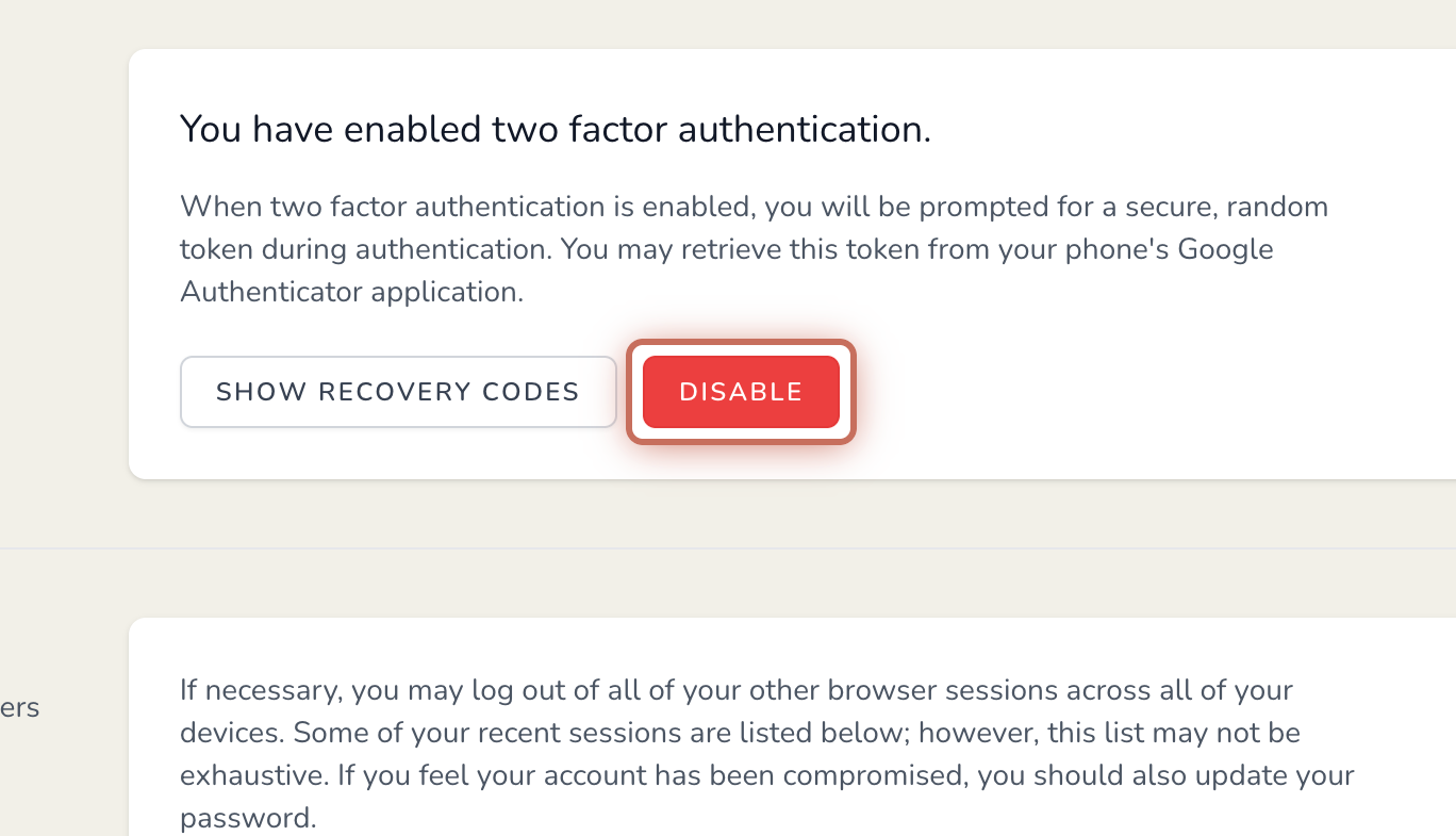 3. Scroll down to the Two Factor Authentication section and click DISABLE.